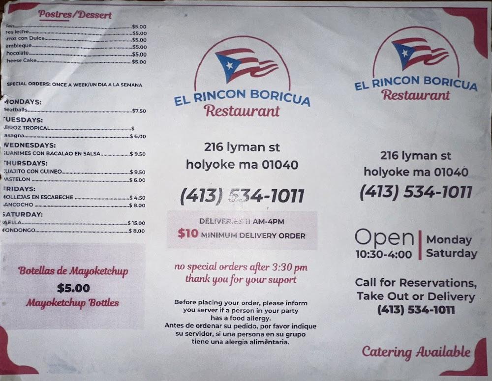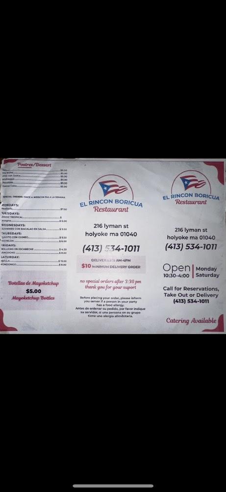 Welcome to El Rincon Boricua Restaurant, your vibrant destination for authentic Puerto Rican and Latin American cuisine in Holyoke, MA. Conveniently located at 216 Lyman St, we offer a delightful array of traditional dishes, including our popular mofongo, all served in a relaxed and inviting atmosphere. Enjoy a quick bite or a leisurely meal with options for breakfast, lunch, and dinner. With services such as delivery, takeout, and on-site dining, we cater to every need. Join us for a taste of local specialties, excellent coffee, and delicious desserts. Reservations are welcome, making it perfect for groups and solo diners alike!